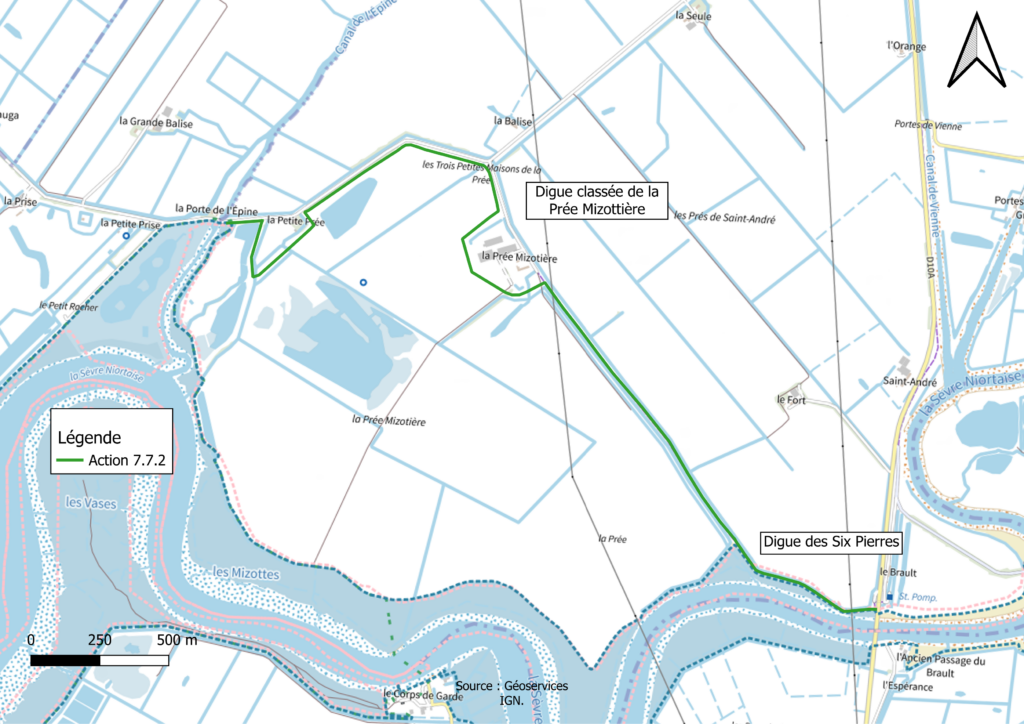 Depuis quelques années, le Syndicat mixte s’attelle à réaliser des travaux de confortements et de rehausses des digues maritimes de son territoire. En 2025, le chantier réalisé a été celui de la digue de la Prée Mizottière et de la digue des Six Pierres au sein de la commune de Sainte-Radégonde-des-Noyers et de Puyravault, à proximité du Pont du Brault.